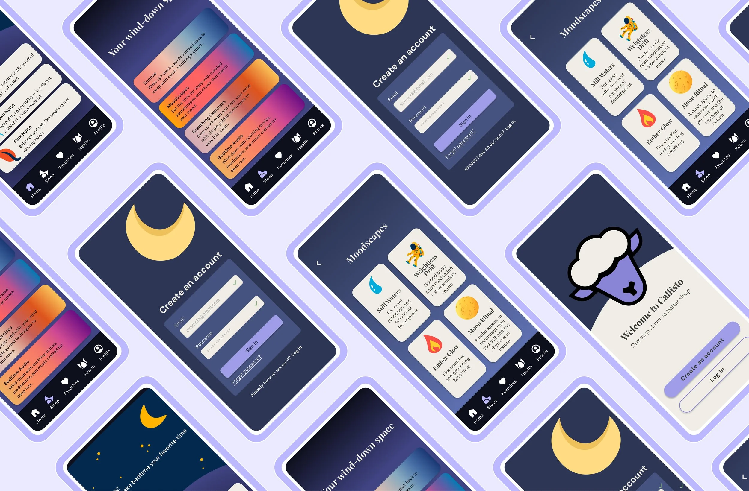 Callisto is a conceptual sleep wellness app designed to address the rising challenge of inconsistent and poor-quality sleep. I designed Callisto for four primary personas: