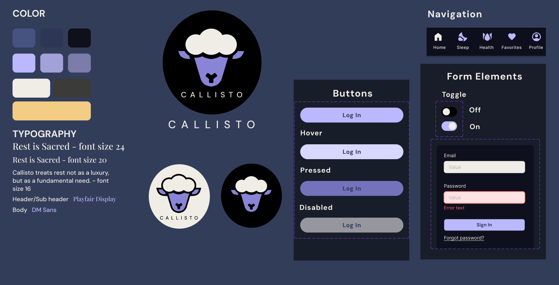 Color Palette: Navy, lilac, and cream were selected for contrast, calm, and accessibility at night.