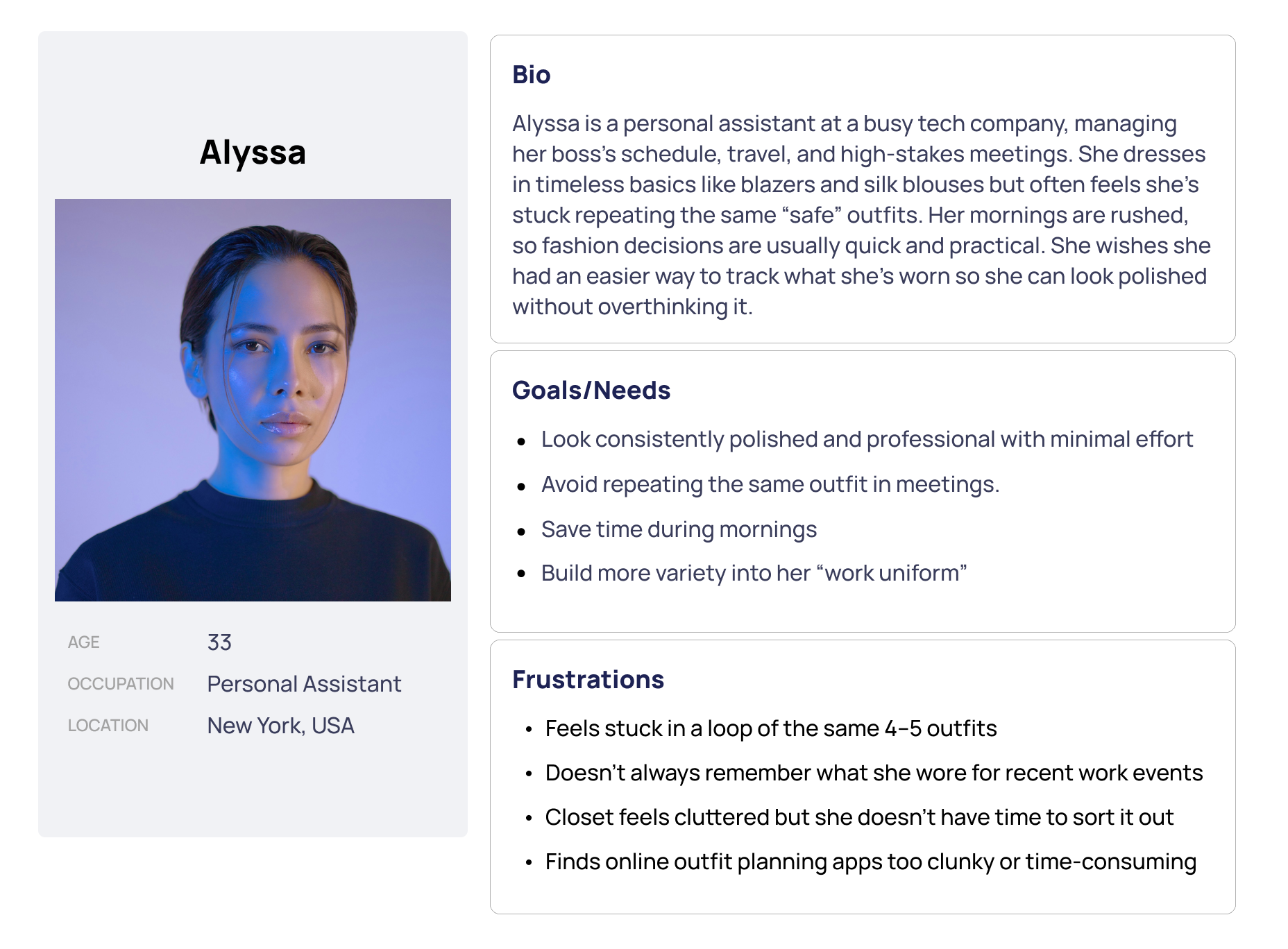 Conducted user interviews with 5 participants to identify problems across different users regarding decision-making as it relates to wardrobes, validating that wardrobe overwhelm and decision fatigue were widespread issues affecting daily routines and special occasions.