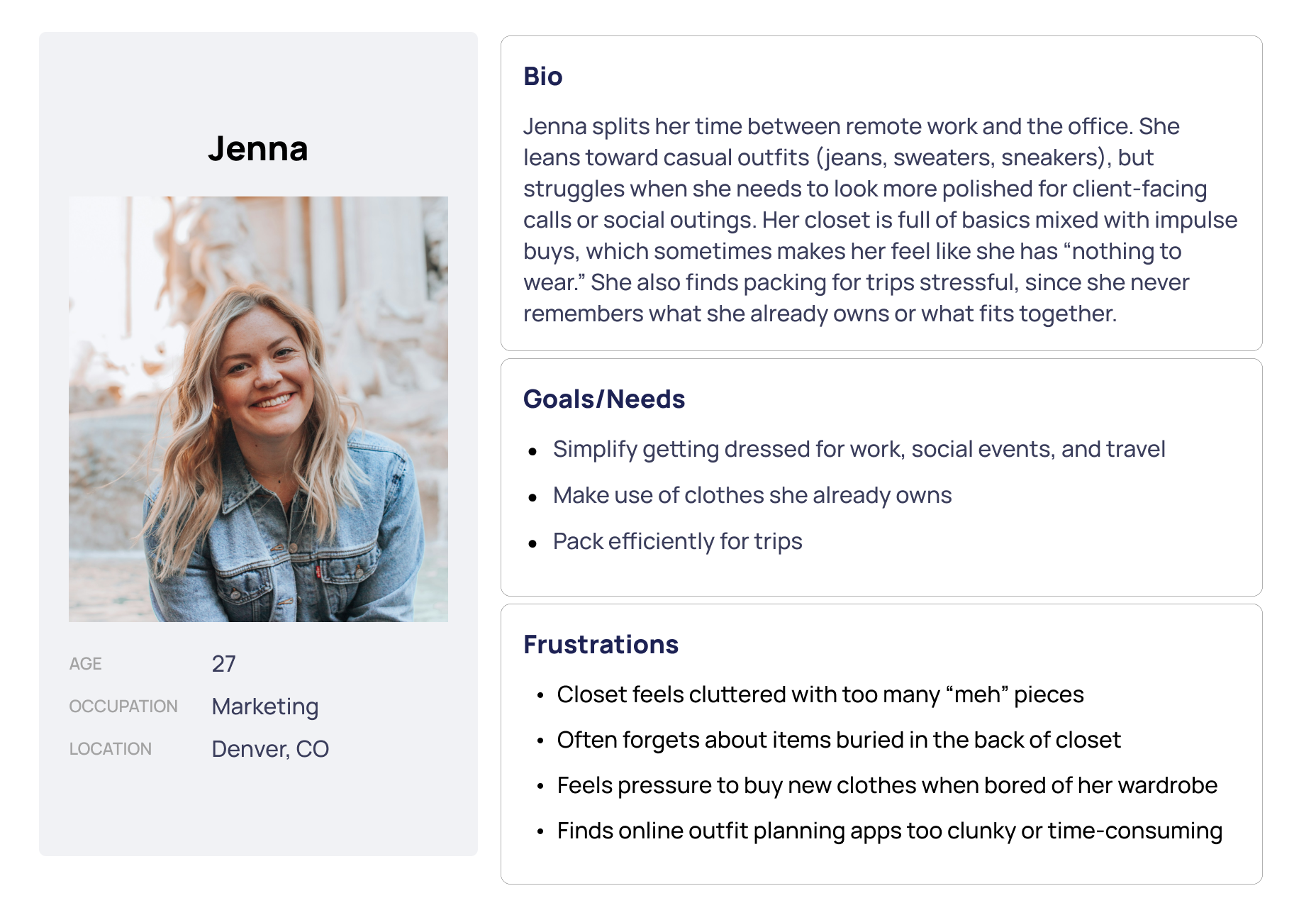 Created an affinity map to synthesize interview data, revealing key pain points: feeling uninspired by their closet, forgetting to donate sentimental items, messy drawer organization, and increased pressure when choosing outfits for date nights or special events.